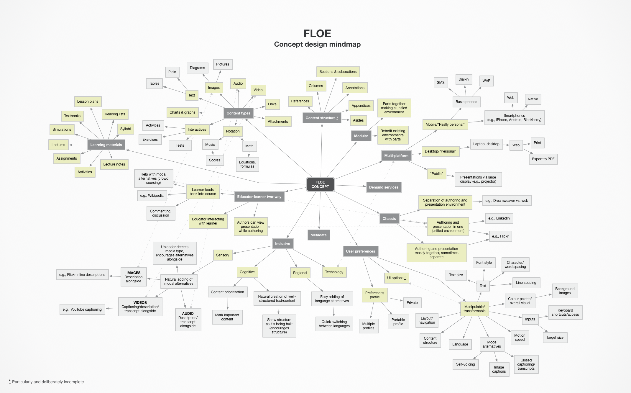 Figure 1: Floe concept design mindmap illustrates the many different ideas and parts which work together to enable a one-size-fits-one education.